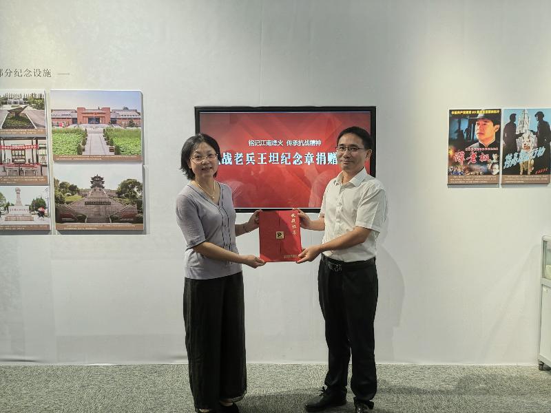 现场,乐江主任向苏州革命博物馆捐赠其外公、抗战老兵王坦所获得的“解放东北纪念”章、“华北解放纪念”章和“全国人民慰问人民解放军代表团赠”章等3枚纪念章,以实际行动共同致敬抗战精神,赓续红色血脉。
