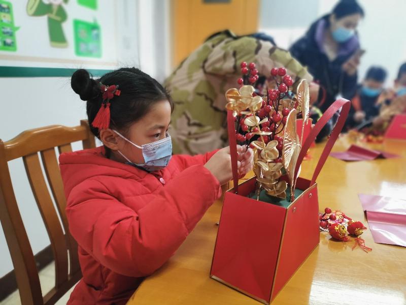 2月12日,大年初一,组织青少年动手制作属于自己年宵花,祝福新的一年家庭事业红红火火,财运亨通。年宵花活动旨在丰富青少年精神文化,体验插花的艺术美感,为喜迎新春增添些许年味。工作人员给孩子们讲解新年纳福传统,剪裁整理花材,折新春福扇、学习花艺基础知识。