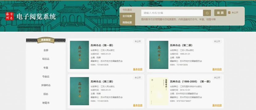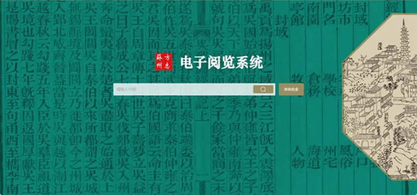 苏州市数字方志馆是由苏州市地方志办公室为配合苏州市实体方志馆迁建工程,立项组织实施的市级数字化项目。项目充分利用了地方志数据资源的独特优势,建成了全市地方志数据资源中心,主要功能架构有编目管理系统、馆藏管理系统、电子阅览系统、协同编修系统、综合管理系统以及全文型数据库共六大功能模块。其中电子阅览系统为社会公众免费提供书籍全文检索服务,基本实现苏州大市范围内各类地方志书籍全覆盖,真正做到市、县(区)、乡镇各级地方志工作机构共建共享。